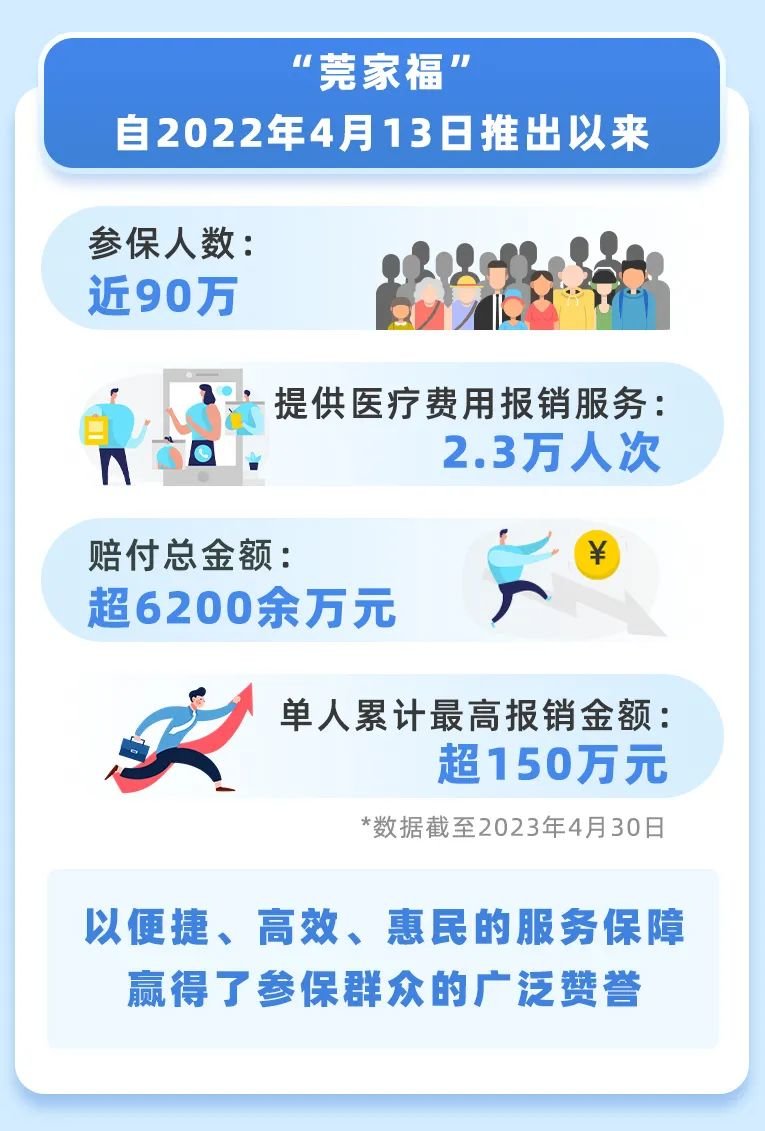 2022年,“莞家福”积极发挥补充医疗保障作用,累计参保人数近90万人,截止至2023年4月30日,提供医疗费用报销服务2.3万人次,累计赔付超6200余万元,切实减轻群众医疗负担,获得广大群众一致好评。