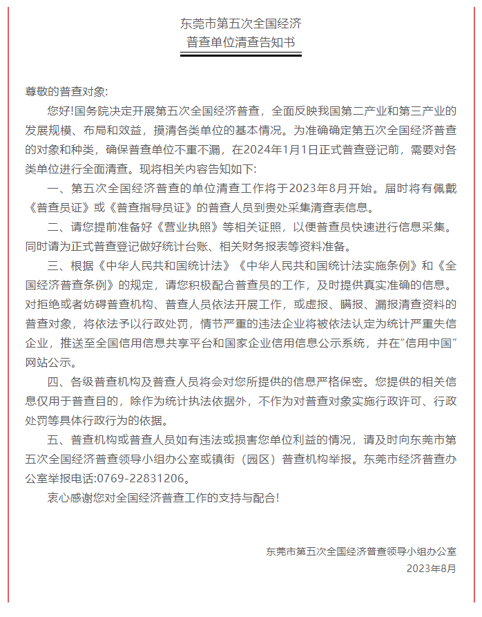 8月2日,东莞市统计局发布《东莞市第五次全国经济普查单位清查告知书》,届时将有佩戴《普查员证》或《普查指导员证》的普查人员到清查对象单位采集清查表信息。