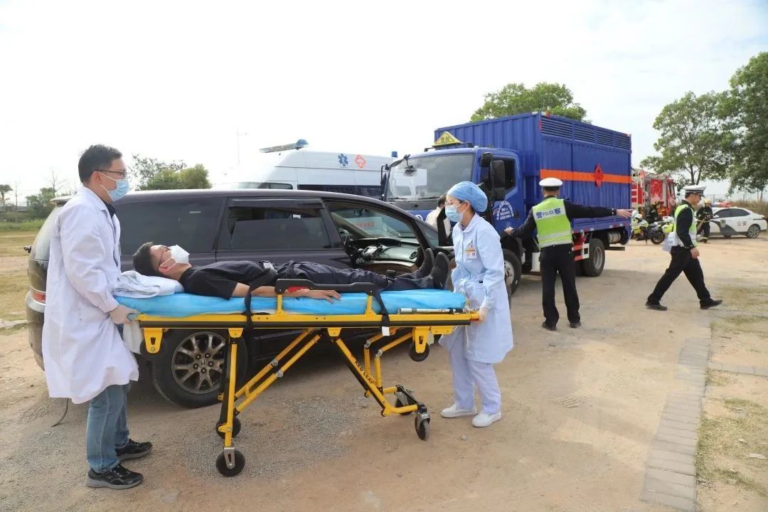 演练模拟了一起严重的交通事故,出现车辆碰撞、人员受伤等警情。