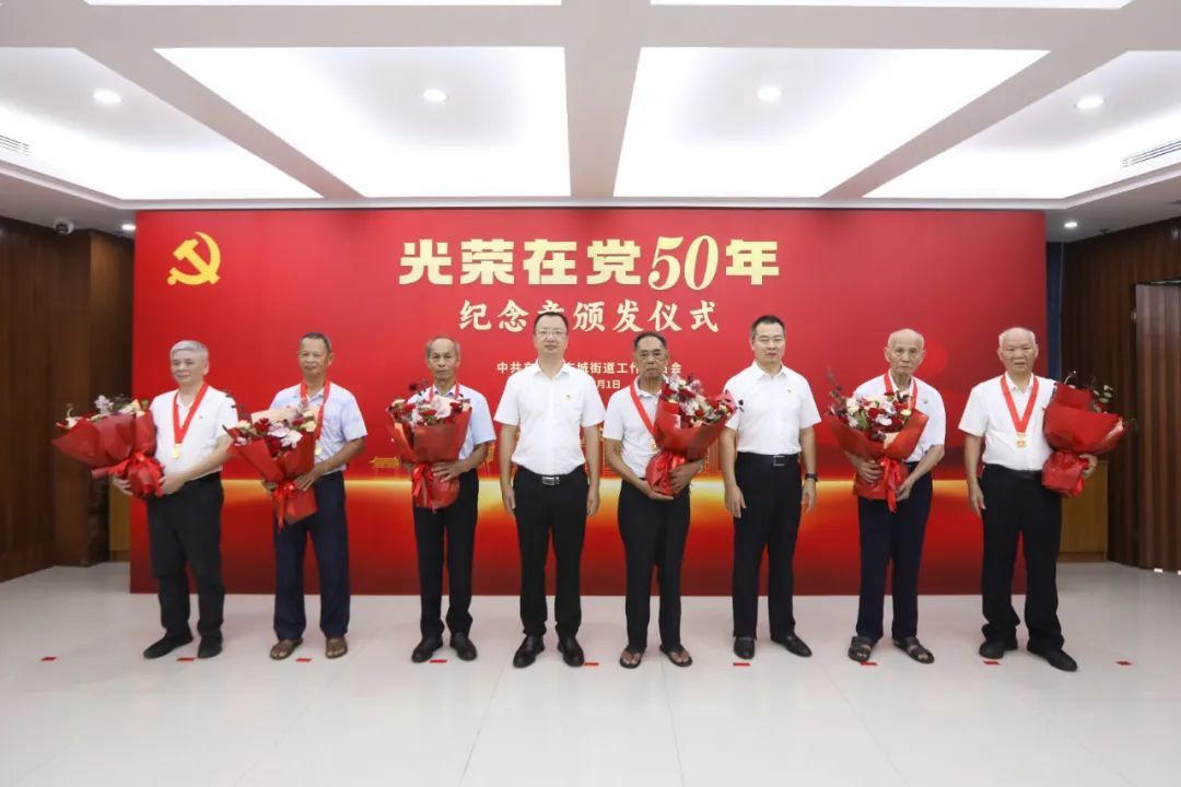 街道党工委副书记、办事处主任陈东成,街道党工委副书记尹志岗,街道党工委委员梁桂荣参加纪念章颁发仪式,并为11名老党员代表颁发“光荣在党50年”纪念章,送上鲜花,向他们致以崇高敬意和诚挚问候。