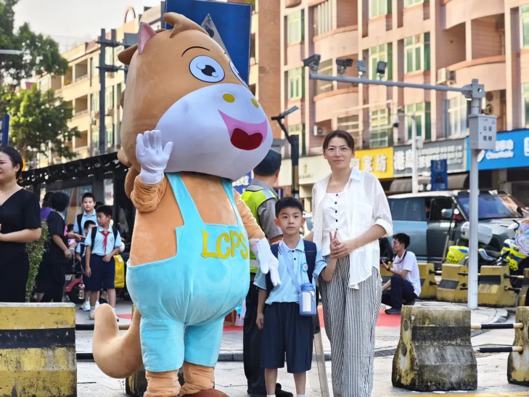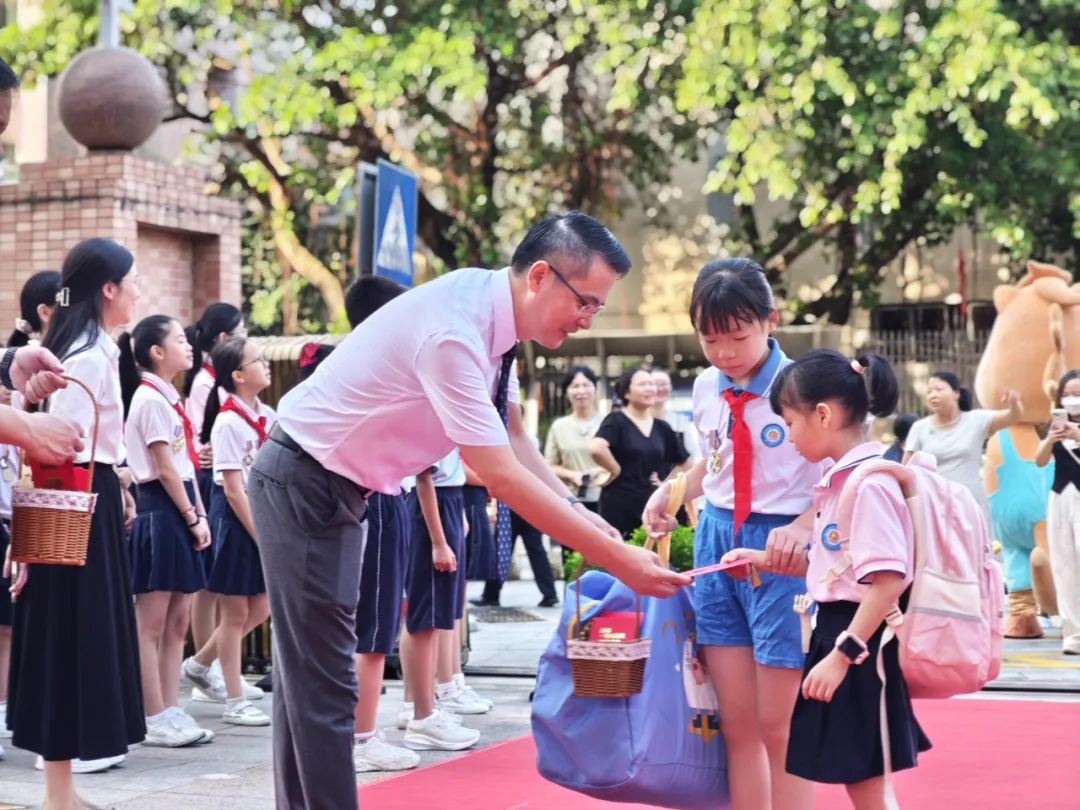 “同学,早上好。欢迎您来到中心小学,这是学校给你的祝福,祝你学习不断进步,天天开心。”在寮步镇中心小学门口,老师和学校的美德少年们早早地排成两排,夹道欢迎前来上学的同学。一年级新生拿着心意满满的小礼物,走入校园,走进教室。