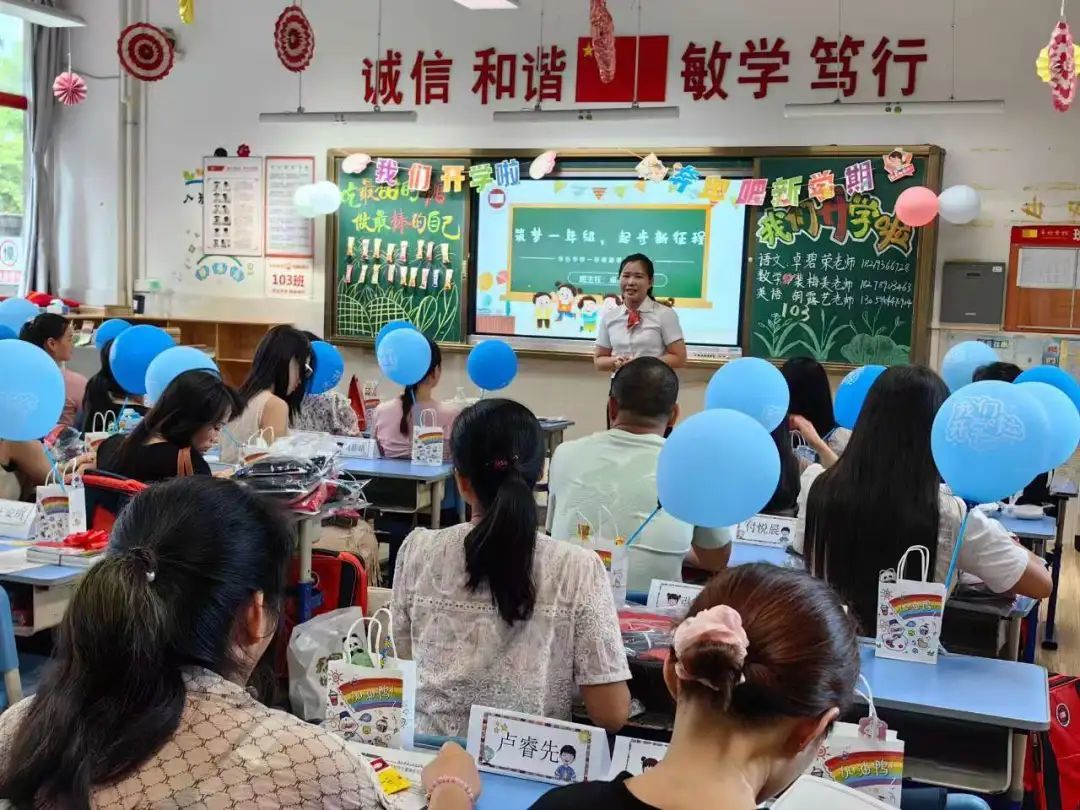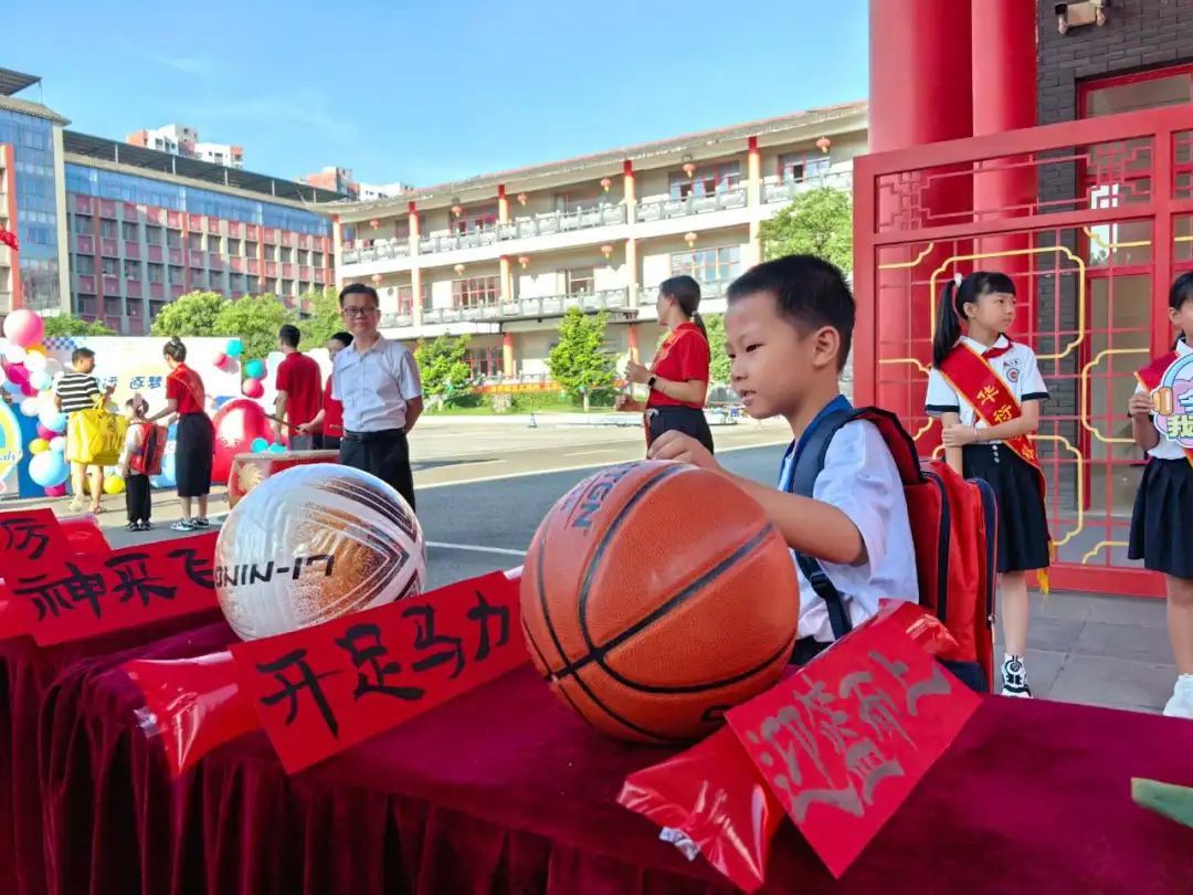 为迎接可爱的“神兽们”归来,华衍学校精心布置,拱门、红毯、气球......营造满满的开学仪式感。大门前的桌子上摆放了足球、篮球,寓意新学期“开足马力”“迎篮而上”,寄托了对学子的美好愿望;广场上,家长和孩子们纷纷到打卡墙拍照留念,开启新学期的美好记忆;教室里,老师与家长亲切交流,建立起了良好的家校情感连接。