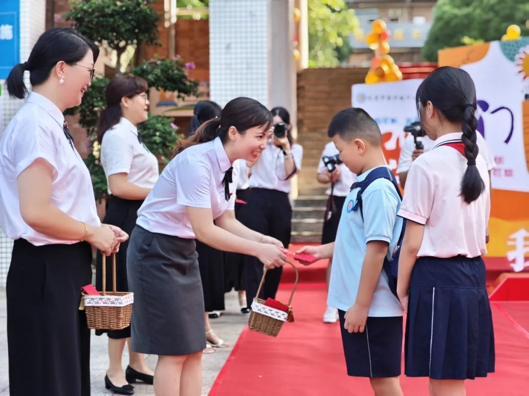迎着朝阳,同学们怀着对新学年的美好憧憬走进学校,在老师和“小礼仪”的指引下,领取糖果,寓意新学期开开心心。
