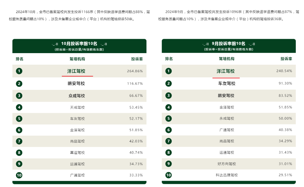 众多消费者报考的洋江驾校成为了投诉的焦点,东莞市交通局公布的数据显示,在2024年7-10月的驾校投诉率排行榜上,该校投诉率节节攀升,每月都在投诉率排行榜首位,在10月投诉率甚至高达264.86%。
