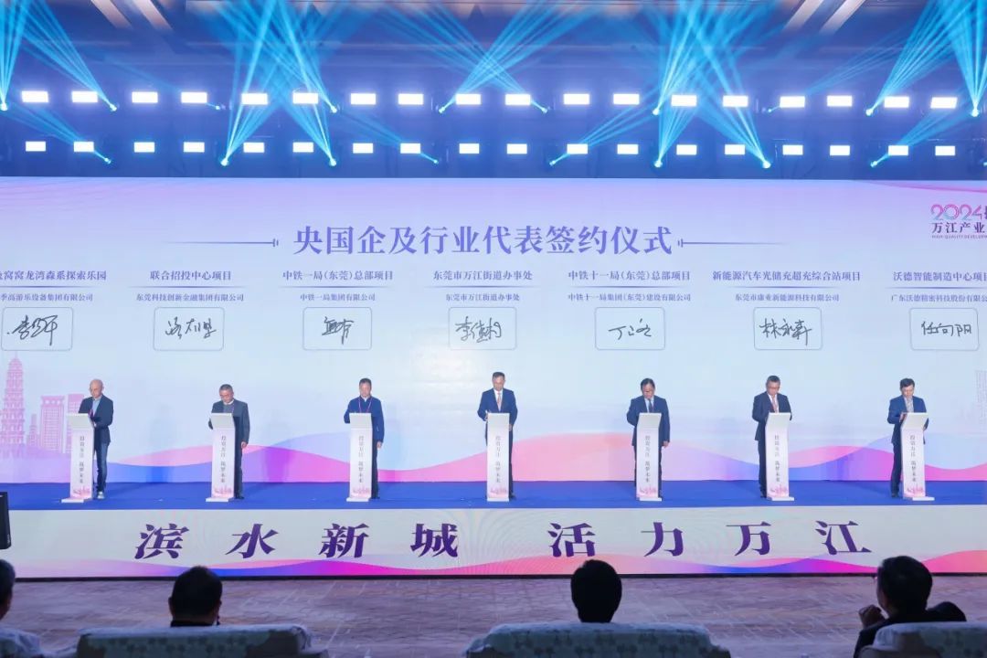 大会现场举行了项目签约仪式。万江街道与中铁十一局(东莞)总部项目、中铁一局(东莞)总部项目、新能源汽车光储充超充综合站项目、联合招投中心项目、沃德智能制造中心项目、季高兔窝窝龙湾森系探索乐园、新村产业园区智能制造中心项目、惠储储能科技项目、铭丰生物质运营中心项目、迈邦健康科技产业中心项目、巨力集团全球总部与高端制造中心项目、普华智能制造产业中心项目、种德科技创新中心项目、光达制造·万江科技园项目、恒溢建筑业联合大厦项目、严屋智造产业园项目、希尔顿花园酒店项目进行签约,签约项目17宗,涵盖了智能装备、新能源、新文旅、新材料、大健康、建筑业等众多领域,标志着万江招商引资工作进入了新阶段。