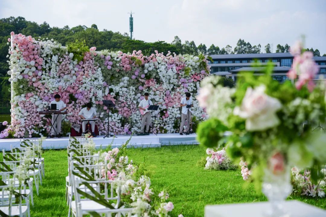 东莞迎宾馆坐拥水濂山与东莞植物园生态腹地,超80%绿植覆盖率为婚礼提供天然布景。月湖广场、迎宾草坪、山顶草坪、月桂草坪,四大户外草坪赋能创意婚礼,与总面积3000㎡,12米挑高无柱的迎宾厅、圆厅、湖畔西餐厅等宴会厅形成场景矩阵,配合国际品牌音响、降噪系统及独立接亲别墅,构建出“仪式+婚宴+住宿”的一站式婚庆生态,既能满足个性化需求,又能享受品质服务,从面子到里子都能满足。2022年至今,酒店已为超过500对新人举办婚礼,已成为东莞婚宴市场的标杆性场所和湾区婚礼圣地。
