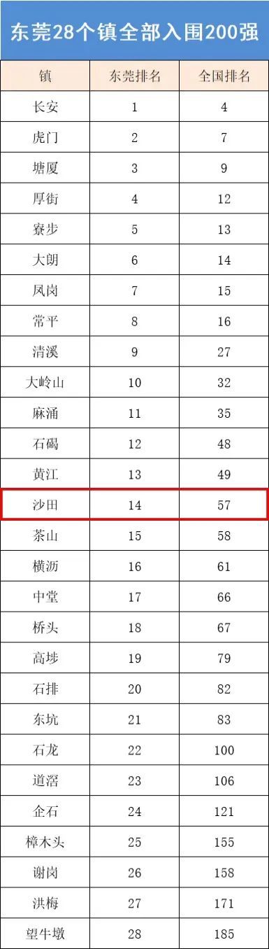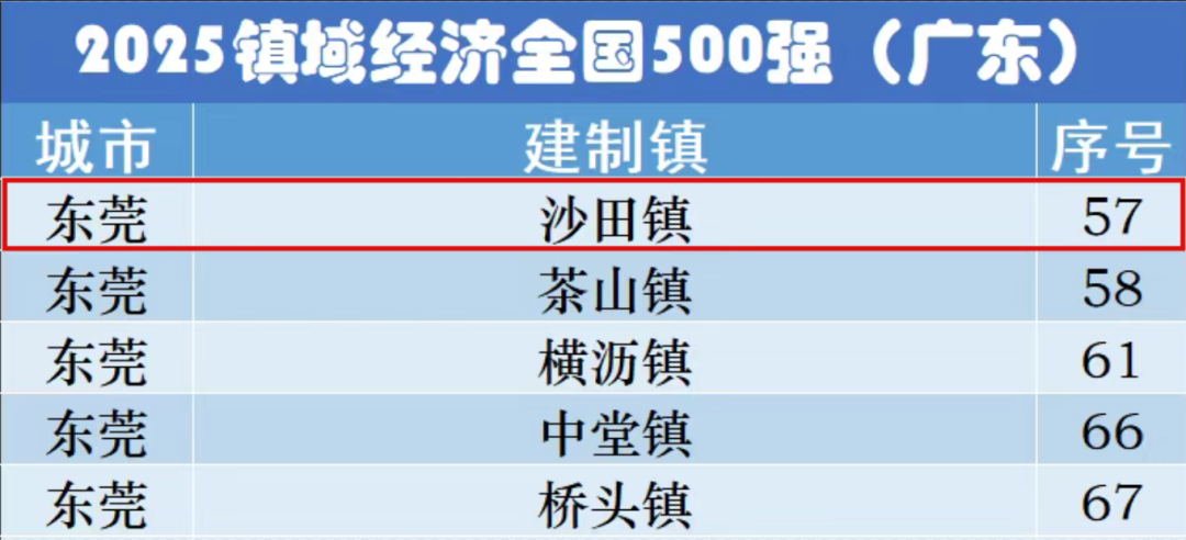 2025镇域经济500强榜单新鲜出炉,沙田再次上榜全国100强,排名第57名。