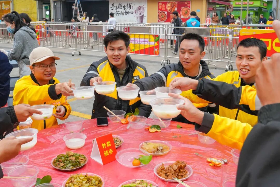 “平时跑单忙,随便对付一口是常态。今天能坐下来吃上这么暖和的‘流水席’,心里真的很热乎!”一位外卖小哥笑着说。